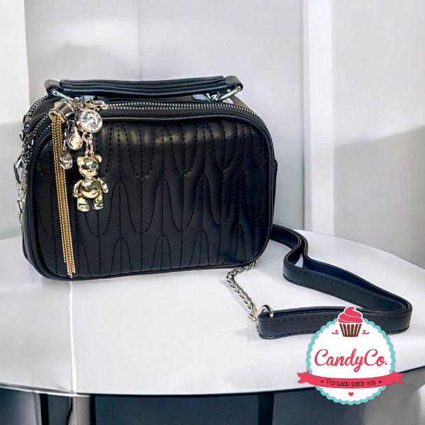 Cartera, Bandolera con Diseño Bordado de Ondas y Detalles Plateados, Borla y Dije con Strass y Oso