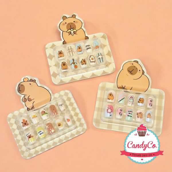 Set de Uñas Postizas Infantiles Estampadas X10 con Diseño de Carpincho, Capybara, Capibara