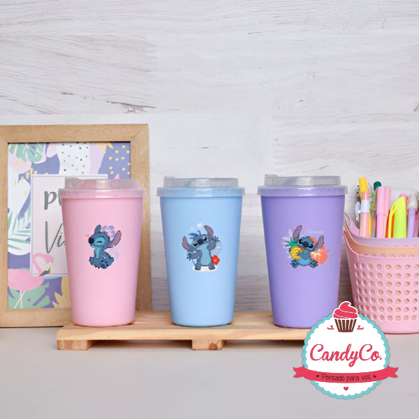 Vaso Pastel con Diseño de Stitch y Tapa con Glitter, Destellos, Brillo 500Ml
