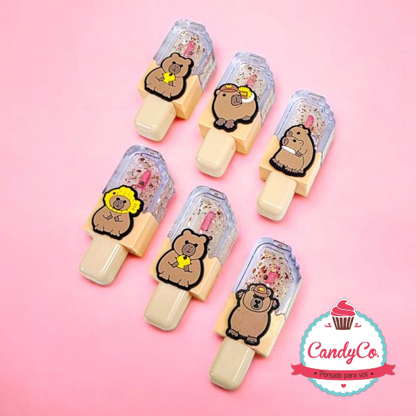 Brillo Labial Líquido con Forma de Paleta de Helado Mordido y Muñeco de Silicona Carpincho, Capybara, Capibara