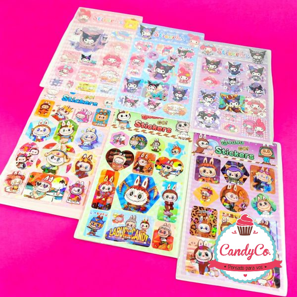 Plancha de Stickers Holográficos con Diseño de Labubu y Kuromi, My Melody, Cinnamoroll, Pompompurin, Sanrio