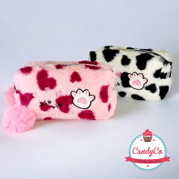 Portacosméticos de Peluche con Manchas y Diseño de Pata, Huella Biu Biu y Pompón