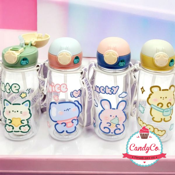 Botella de Plástico Infantil Diseño de Gato, Conejo, Oso, Animal, Cute, Nice, Lucky, Wow con Correa 600Ml