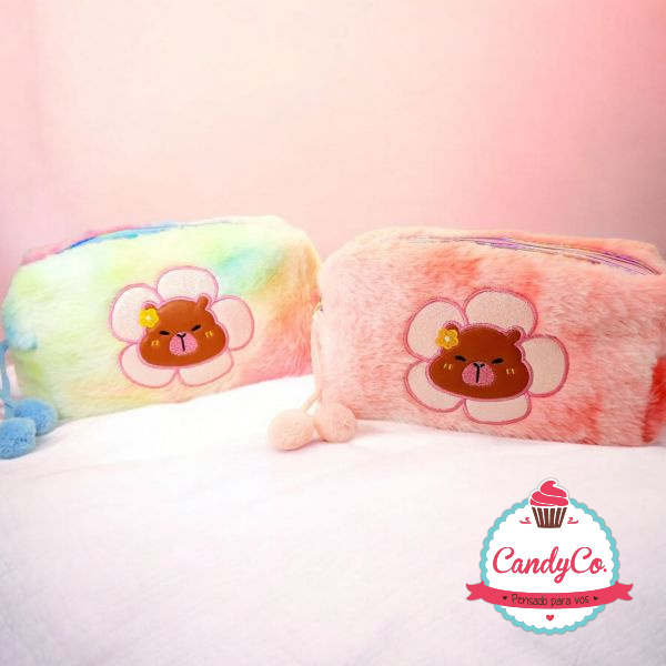 Portacosméticos de Peluche Multicolor con Diseño de Capibara, Capybara, Carpincho y Flor Margarita con Pompones