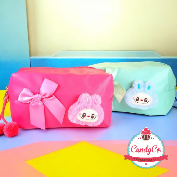 Portacosméticos Liso con Diseño Labubu de Peluche, Moño y Pompones