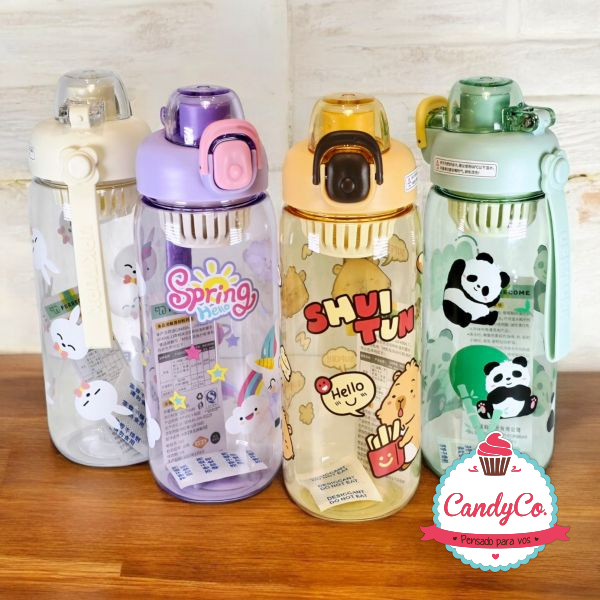 Botella de Plástico Infantil Estampada con Diseño de Dinosaurio Roar!, Oso Panda, Unicornio, Carpincho, Capybara, Capibara con Correa de Silicona 600Ml