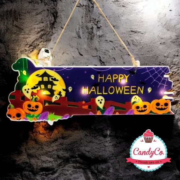 Cartel Happy Halloween con Calabazas, Casa Embrujada y Luces Led a Pilas X3