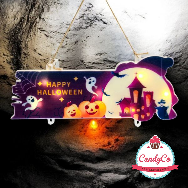 Cartel Happy Halloween con Calabazas, Fantasmas, Murciélagos, Casa Embrujada y Luces Led a Pilas X3