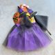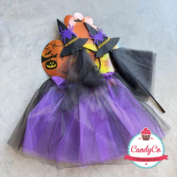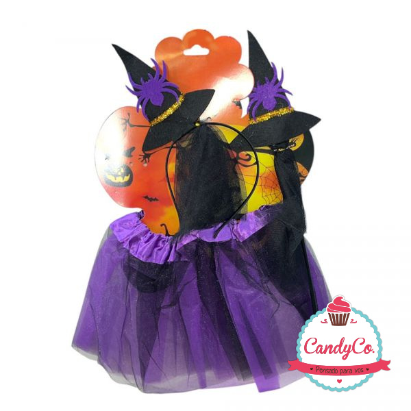 Set de Disfraz de Bruja X3 Piezas con Pollera Violeta y Negra, Vincha con Diseño de Sombrero y Araña, y Varita