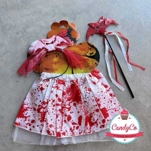 Set de Disfraz de Bruja X3 Piezas con Pollera Blanca con Sangre, Vincha con Diseño de Murciélagos, y Varita