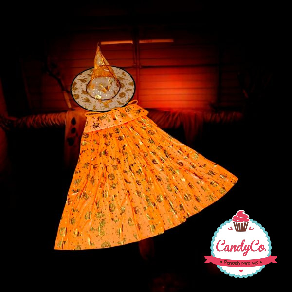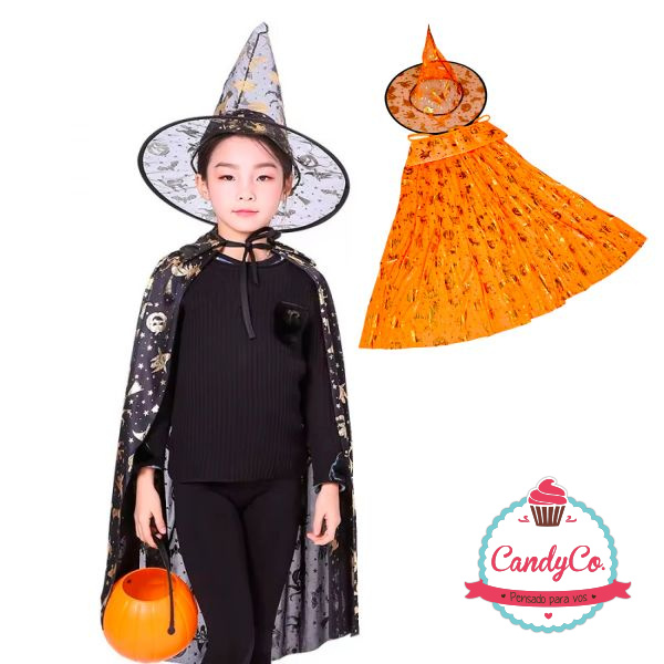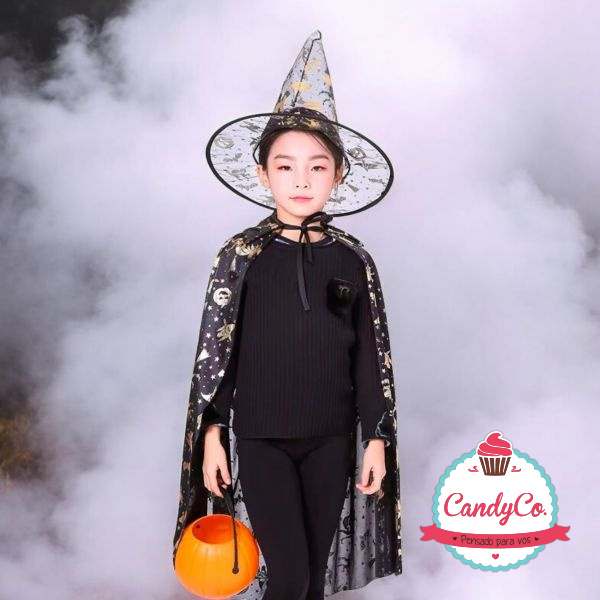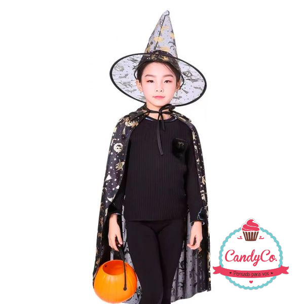 Set de Capa 75Cm y Sombrero Estampados con Detalles Dorados, Plateados, Disfraz de Bruja