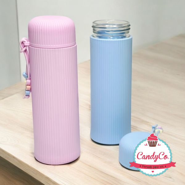 Botella de Vidrio con Funda de Plástico Rayada y Tapa Redondeada con Correa 400Ml