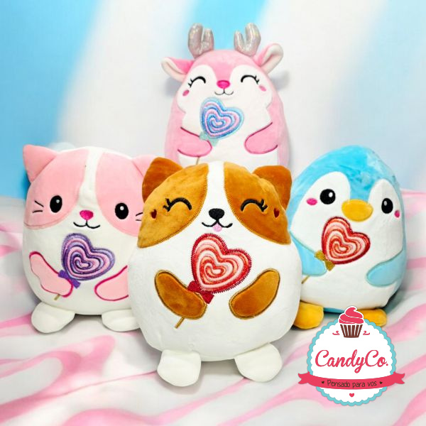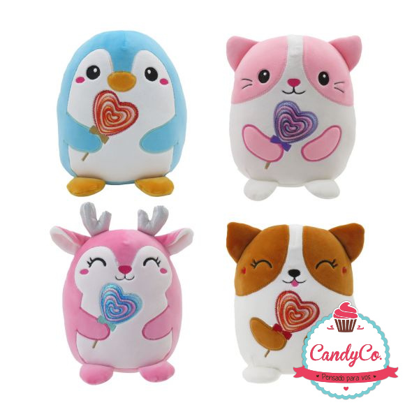 Peluche Animal, Gato, Perro, Ciervo, Pingüino con Paleta de Corazón con Brillos 20Cm