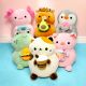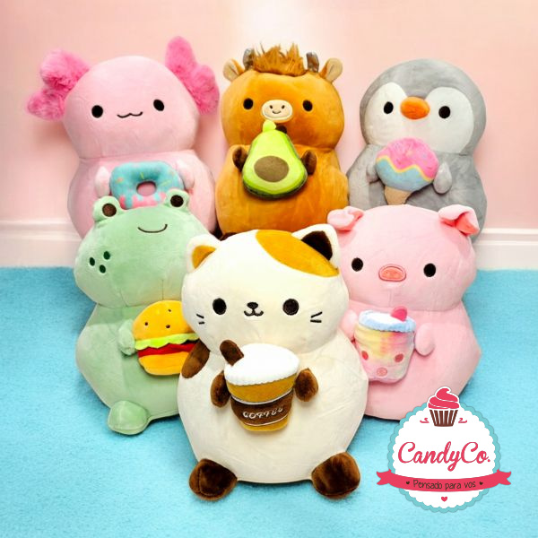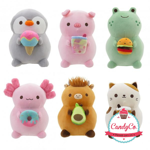 Peluche Animal con Comida, Chancho, Cerdo con Manteada, Rana, Sapo con Hamburguesa, Ajolote con Dona, Gato con Café, Toro con Palta, Pingüino con Helado 24Cm