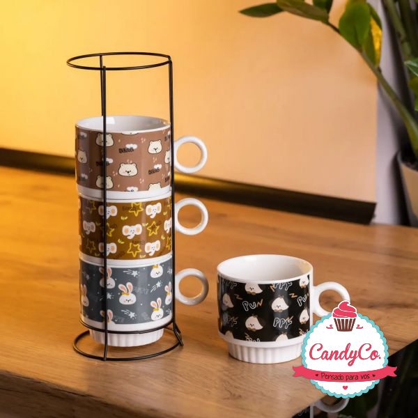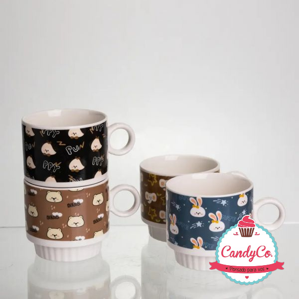Set de Tazas X4 Apilables con Diseño de Animales, Perro, Conejo, Oso, Elefante