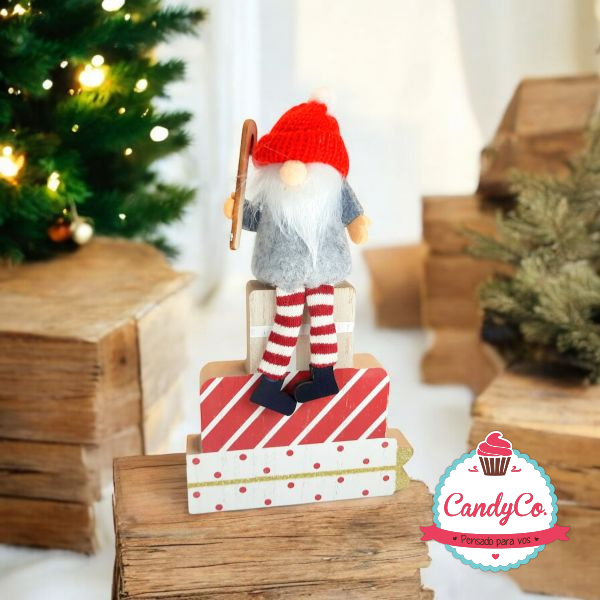 Adorno de Navidad con Base de Madera y Muñeco de Duende con Bastón y Gorro Navideño 21Cm