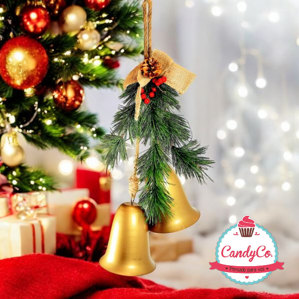 Adorno Colgante de Navidad con Dos Campanas, Moño de Arpillera y Pino con Frutos