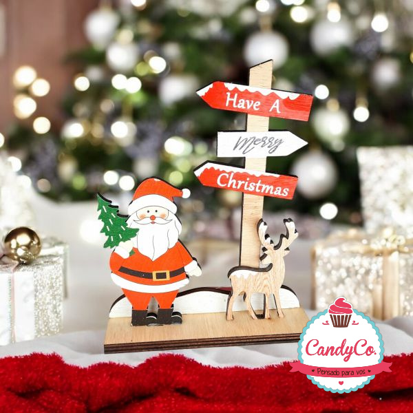 Adorno de Madera con Papá Noel, Poste de Navidad y Reno 16Cm