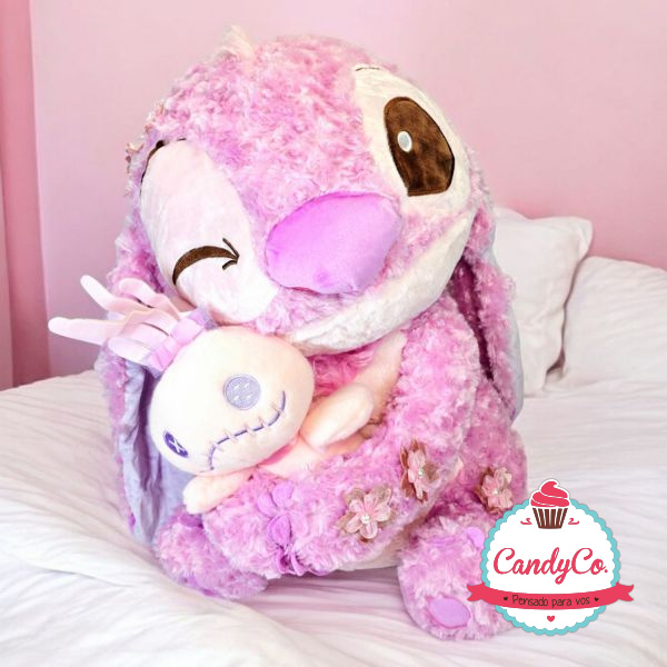 Peluche Stitch Rosa Rizado con Muñeco y Flores 30Cm