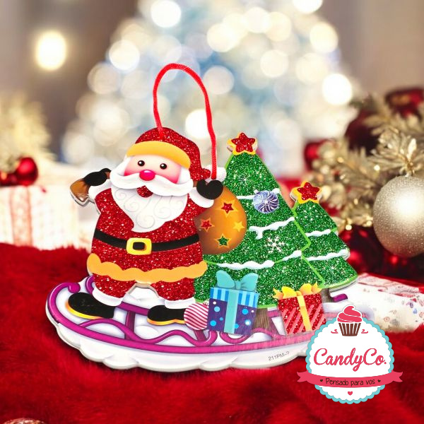 Cartel Colgante con Brillos Diseño de Papá Noel con Árbol de Navidad 20X26Cm