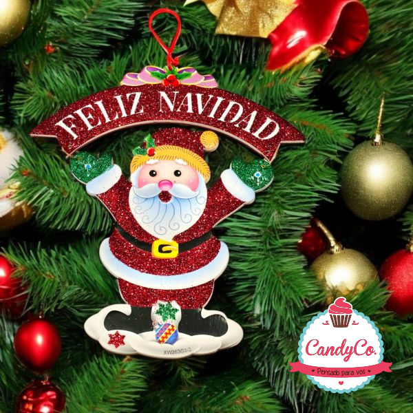 Cartel Colgante Doble con Brillos Diseño de Papá Noel Feliz Navidad 28X26Cm