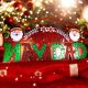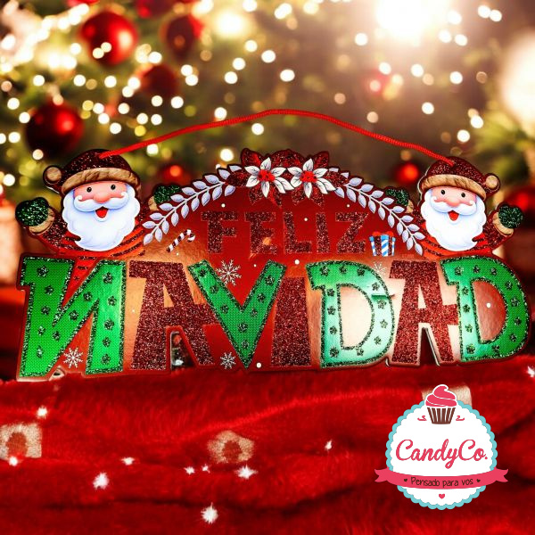 Cartel Colgante Horizontal con Brillos Diseño Feliz Navidad con 2 Papá Noel 19X42Cm