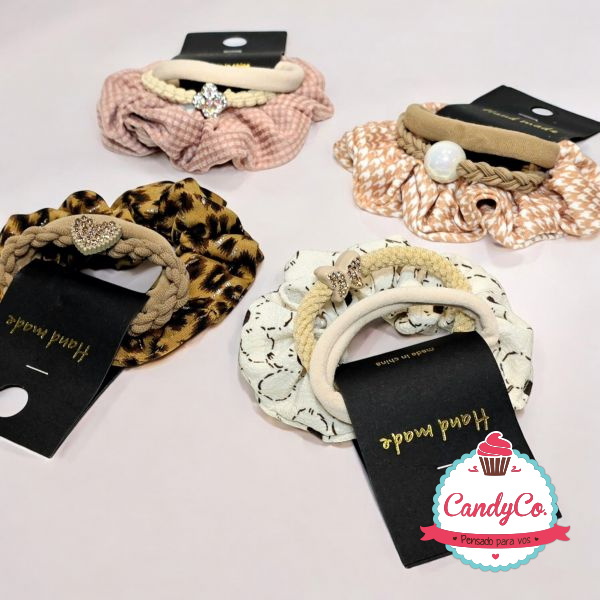 Set de Colitas para el Pelo X3 con Colita Lisa, Colita Trenzada con Aplique con Strass, Perla Tornasolada, y Scrinchy Estampada Varios Modelos