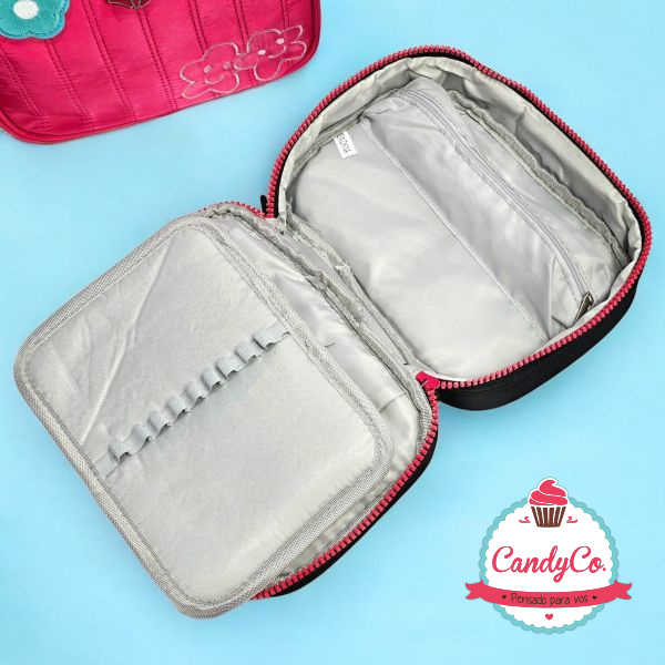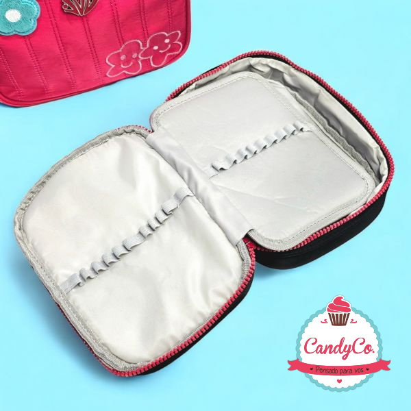 Cartuchera Lisa con Diseño Bordado Rayado, Flor Margarita de Peluche Corderito, y Flores Bordadas Sakali