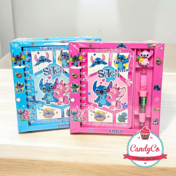Set de Mini Libreta Anillada, Diario y Lapicera Multicolor X4 Colores con Líquido y Brillos Diseño de Stitch y Angel en Caja