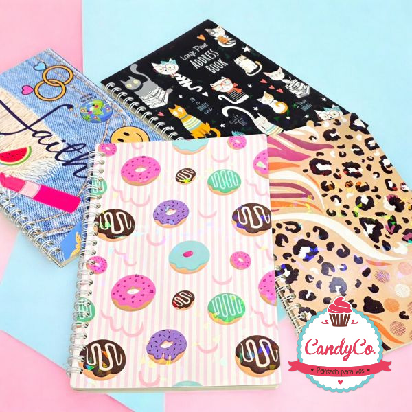 Cuaderno A5 Anillado Estampado con Diseño de Jean Faith, Animal Print, Gatos Address Book, Rayas y Donas Holográfico