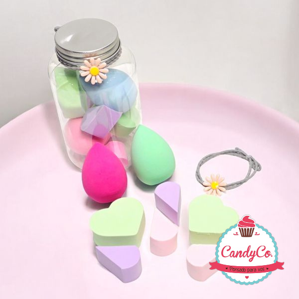 Set de Esponjas para Maquillaje Gotas y Corazones X8 en Frasco de Plástico con Colita para el Pelo Flor Margarita