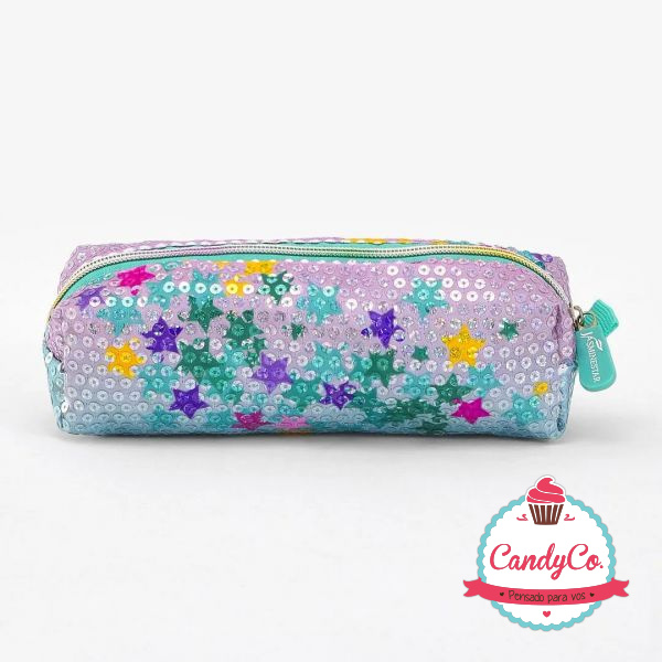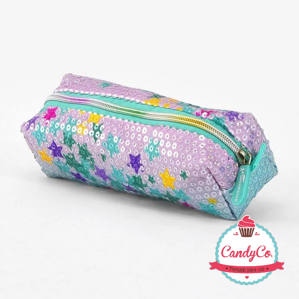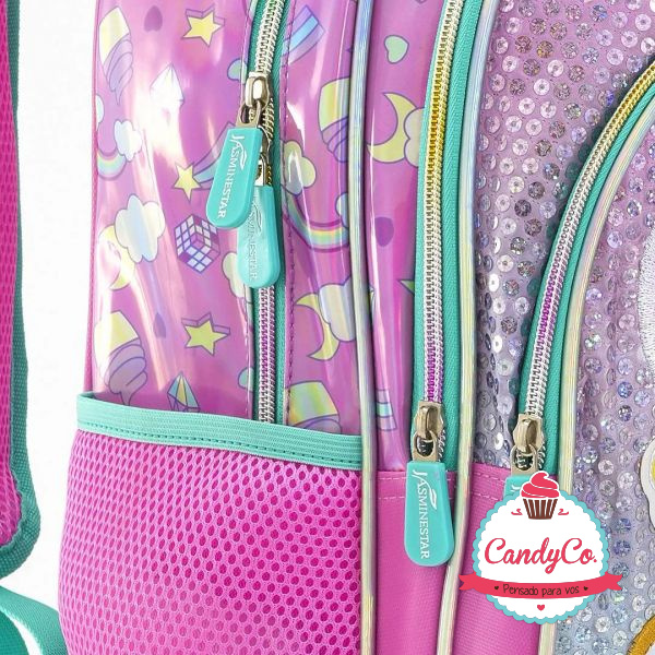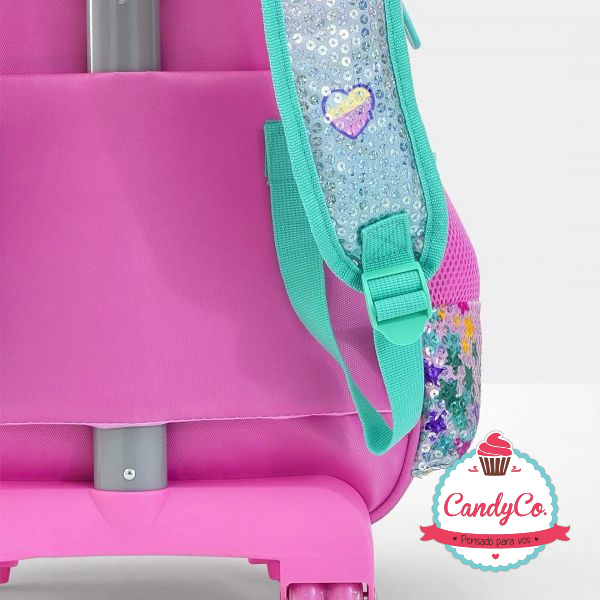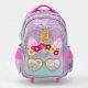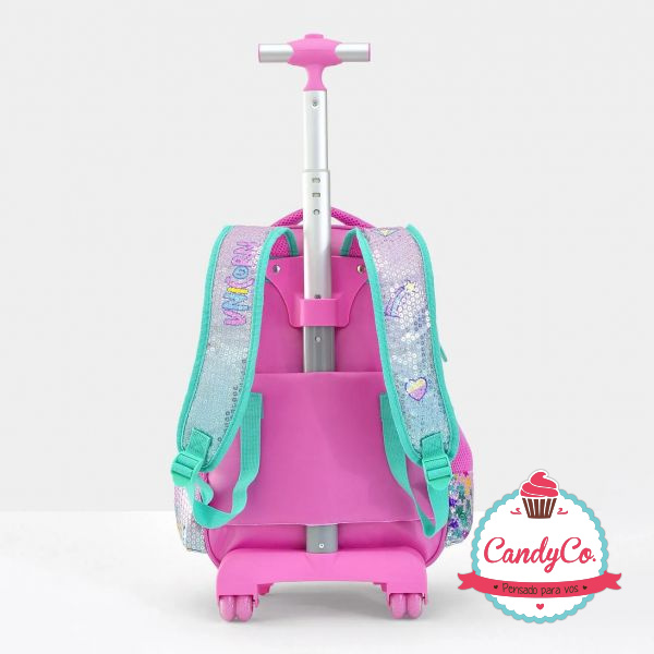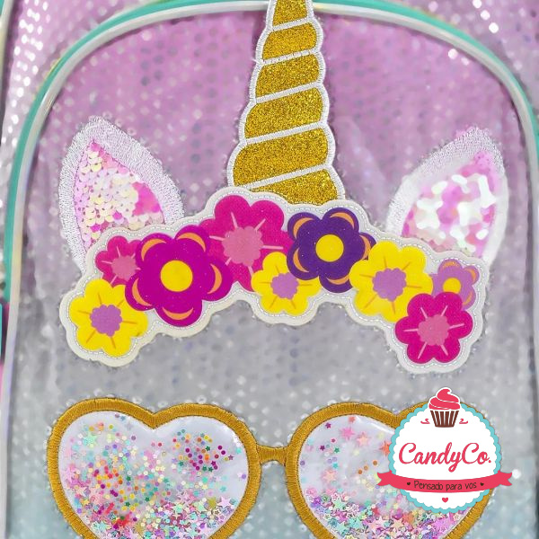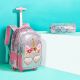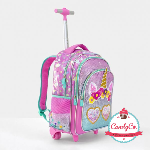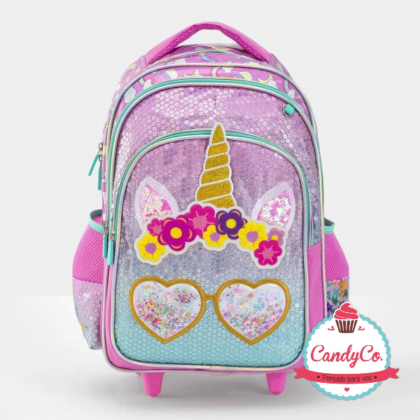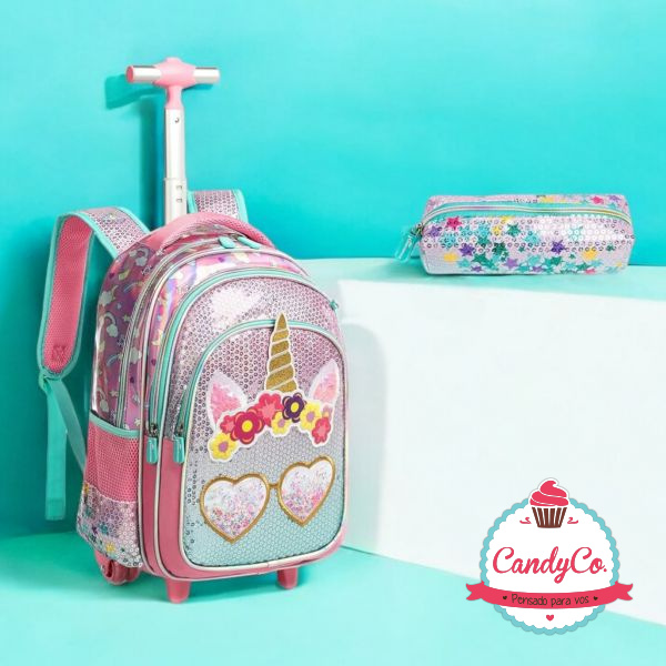 Set de Mochila con Rueditas y Cartuchera con Lentejuelas Diseño de Unicornio con Lentes de Corazón