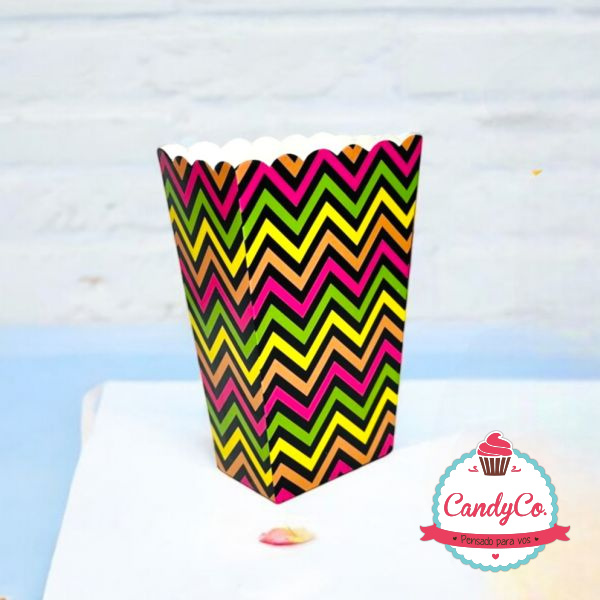 Caja de Cartón Mediana con Diseño Multicolor Fluor Zig Zag para Pochoclos, Palomitas de Maiz 13X7X14Cm