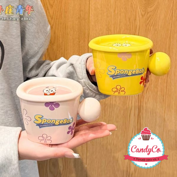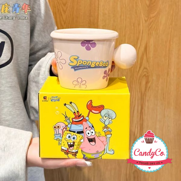 Taza de Cerámica con Diseño de Bob Esponja, Patricio, con Tapa y Manija Redonda