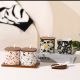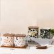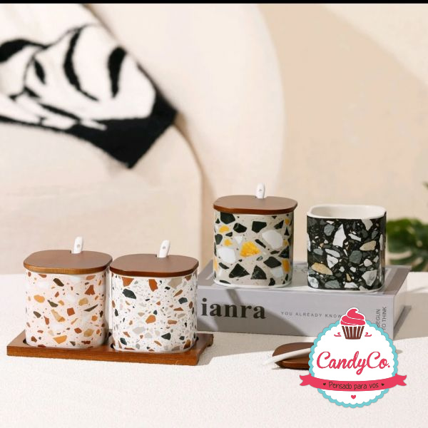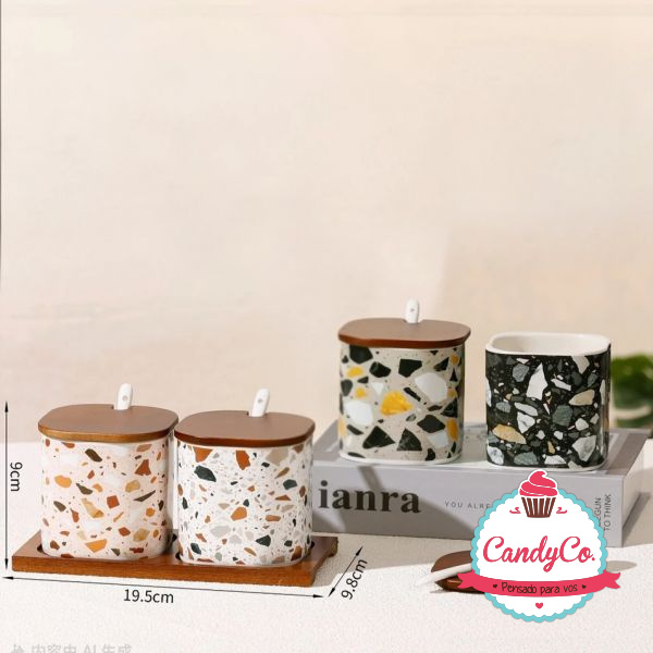 Set de Especieros de Cerámica Diseño de Granito, Mármol, Piedra con Tapa de Madera X2, Bandeja y Cuchara X2