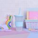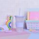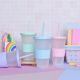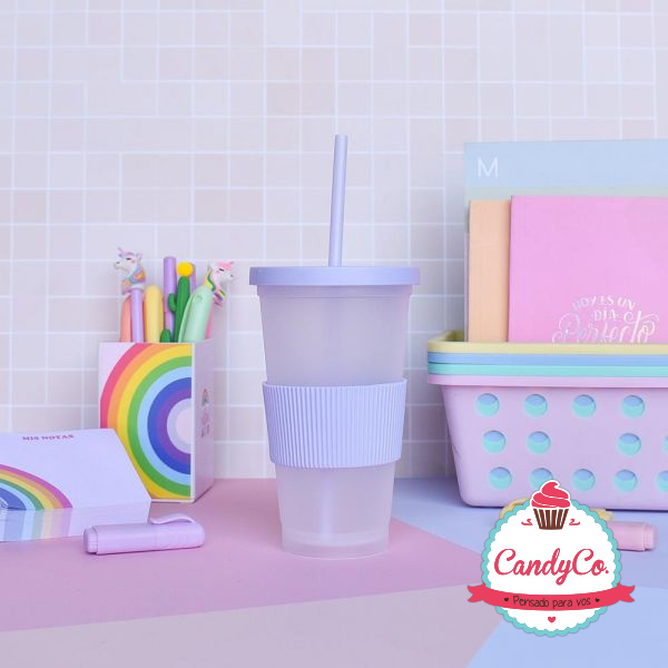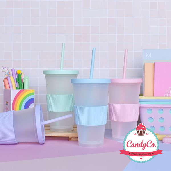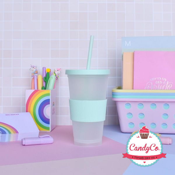 Vaso de Plástico Transparente con Faja, Tapa y Sorbete Pastel