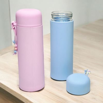 Botella de Vidrio con Funda de Plástico Rayada y Tapa Redondeada con Correa 400Ml