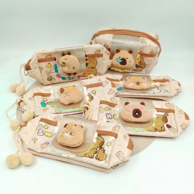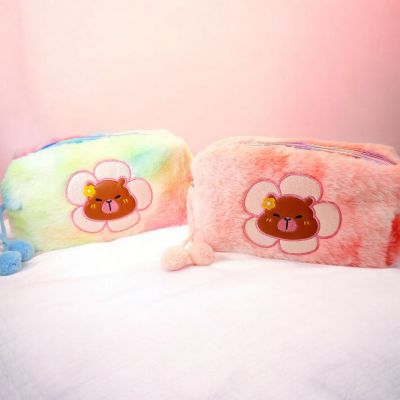 Portacosméticos de Peluche Multicolor con Diseño de Capibara, Capybara, Carpincho y Flor Margarita con Pompones