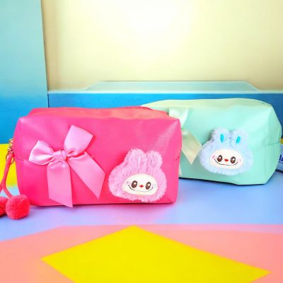 Portacosméticos Liso con Diseño Labubu de Peluche, Moño y Pompones