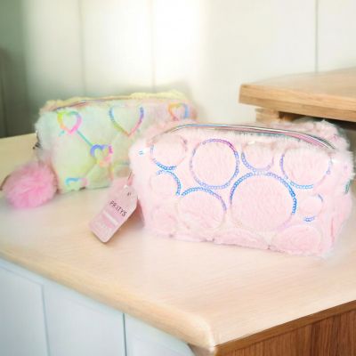 Portacosméticos de Peluche con Diseño de Corazones de Lentejuelas y Pompón