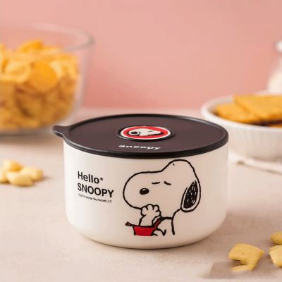 Bowl de Cerámica Blanco Grande Estampado con Diseño de Snoopy y Tapa de Plástico 15,5Cm