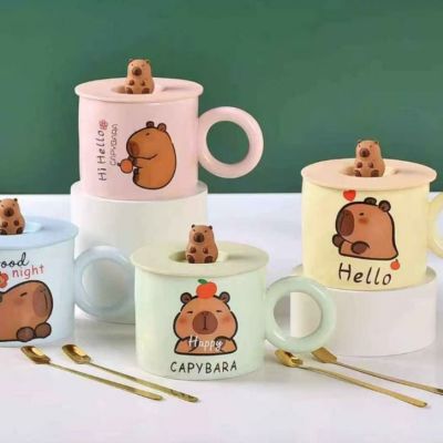 Taza de Cerámica Estampada con Diseño de Carpincho, Capybara, Capibara, con Tapa con Muñeco de Silicona