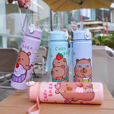 Botella de Plástico Infantil Estampada con Diseño de Dinosaurio Roar!, Oso Panda, Unicornio, Carpincho, Capybara, Capibara con Correa de Silicona 600Ml