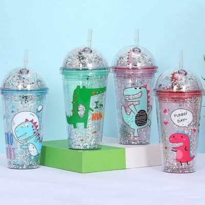Vaso Bajo Estampado con Diseño de Dinosaurios, Tapa con Corona y Sorbete